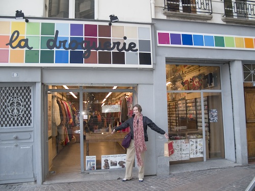 The European adventures have concluded, and I’m back in familiar New York. I’ve bailed my cat out of jail and returned to the routine of packing boxes for the Big Move Out West. Talk about post-vacation reality checks! We’re still working on loading our photos onto the computer – we shot raw images and the computer is apparently a little more geriatric than I would have believed. So unfortunately, we haven’t gotten up to the one of me knitting at the hockey game, or displaying my incredible yarn haul in Milan. But here I am at La Droguerie: