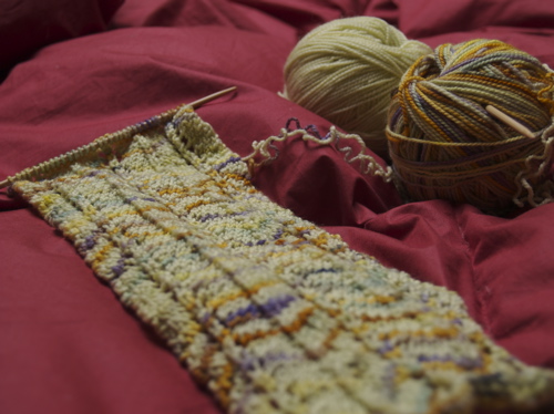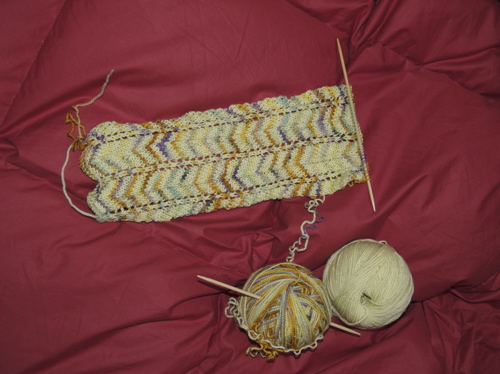 I caught up on past episodes of Dancing with the Stars and cast on a Chevron Scarf ala Domesticat. I try not to stick my thumb out for too many bandwagons, but since I began this project more than two years ago, I’m forgiving myself the lapse. Cat’s zaggy version was so much cooler than the Old Shale start I’d made that I tore out my sad ten inches of abandoned scarflet. It should be the perfect birthday present for my mother-in-law’s 60th in May. Unfortunately, although I’m using the same Koigu and size 3 needles, my scarf isn’t lying as obediently flat as Cat’s. It wants to fold up along the increases and decreases. I’m hoping a vigorous blocking will persuade it of the errors of its stubborn ways. Has anybody else had this problem?